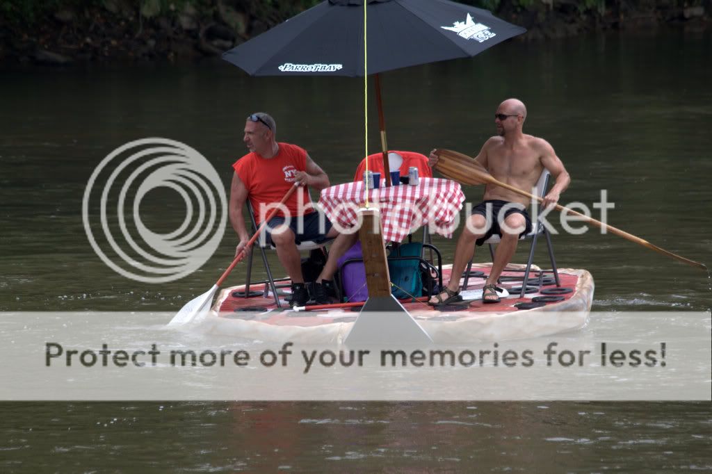| people, and the day went off without incident -- no one was arrested or even stung by a bee. The music was superb, as were the performances by the Baraka Mundi Bellydancers, Asheville Aerial Arts, Asheville Dance Revolution, and the Fines Creek Flatfooters. We had about 43 entries in the Anything that Floats Raft Race (it's more like a parade than a race) -- almost twice as many watercraft as last year.