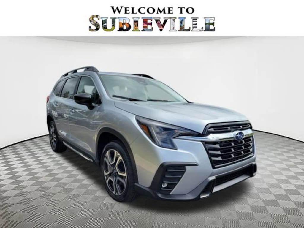 2025 Subaru Ascent Limited Ice Silver Metallic 14 Speakers, 3rd row seats: bench, 4-Wheel Disc Brakes, ABS brakes, Air Conditioning, Alloy wheels, Auto High-beam Headlights, Auto-dimming Rear-View mirror, Automatic temperature control, Brake assist, Bumpers: body-color, Compass, Delay-off headlights, Driver door bin, Driver vanity mirror, Dual front impact airbags, Dual front side impact airbags, Electronic Stability Control, Exterior Parking Camera Rear, Four wheel independent suspension, Front anti-roll bar, Front Bucket Seats, Front Center Armrest, Front dual zone A/C, Front fog lights, Front reading lights, Fully automatic headlights, Garage door transmitter: HomeLink, harman/kardon® Speakers, Heated door mirrors, Heated Front Bucket Seats, Heated front seats, Heated rear seats, Heated steering wheel, Illuminated entry, Knee airbag, Leather Shift Knob, Leather steering wheel, Low tire pressure warning, Memory seat, Navigation System, Occupant sensing airbag, Outside temperature display, Overhead airbag, Overhead console, Panic alarm, Passenger door bin, Passenger vanity mirror, Perforated Leather-Trimmed Upholstery, Power door mirrors, Power driver seat, Power Liftgate, Power moonroof, Power passenger seat, Power steering, Power windows, Radio data system, Rear air conditioning, Rear anti-roll bar, Rear reading lights, Rear window defroster, Rear window wiper, Reclining 3rd row seat, Remote keyless entry, Security system, Speed control, Speed-sensing steering, Split folding rear seat, Spoiler, Steering wheel mounted audio controls, Tachometer, Telescoping steering wheel, Tilt steering wheel, Traction control, Trip computer, Turn signal indicator mirrors, Variably intermittent wipers, Wheels: 20" x 7.5 J Dk Gray Alloy w/Machine Finish. AWD Lineartronic CVT 2.4L 4-Cylinder DOHC 16V