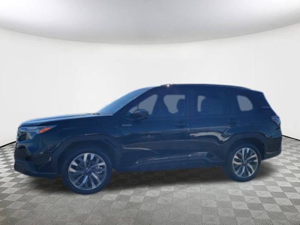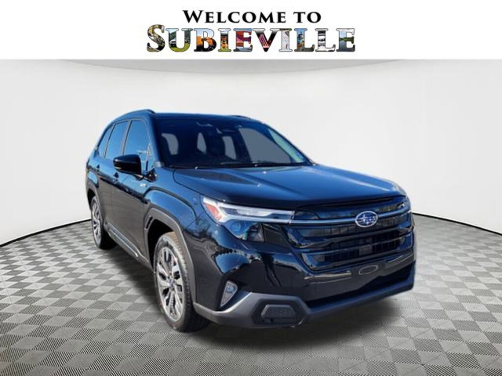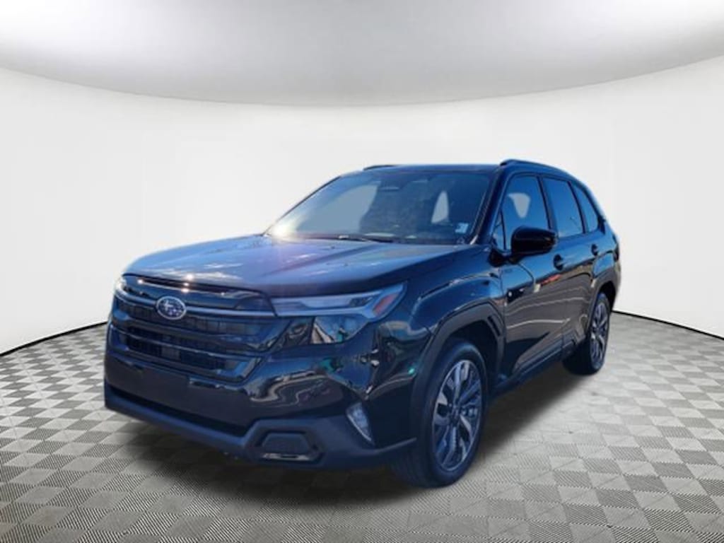 2025 Subaru Forester Hybrid Touring Crystal Black Silica 11 Speakers, 4-Wheel Disc Brakes, ABS brakes, Air Conditioning, Alloy wheels, AM/FM radio: SiriusXM with 360L, Anti-whiplash front head restraints, Auto High-beam Headlights, Automatic temperature control, Brake assist, Bumpers: body-color, Compass, Driver door bin, Driver vanity mirror, Dual front impact airbags, Dual front side impact airbags, Electronic Stability Control, Emergency communication system: MySubaru Safety (3-year free trial), Exterior Parking Camera Rear, Four wheel independent suspension, Front anti-roll bar, Front Bucket Seats, Front Center Armrest, Front dual zone A/C, Front fog lights, Front reading lights, Fully automatic headlights, harman/kardon® Speakers, Heated and Ventilated Front Bucket Seats, Heated door mirrors, Heated front seats, Heated rear seats, Heated steering wheel, HVAC memory, Illuminated entry, Knee airbag, Low tire pressure warning, Memory seat, Navigation system: TomTom Navigation w/what3words, Occupant sensing airbag, Outside temperature display, Overhead airbag, Overhead console, Panic alarm, Passenger door bin, Passenger vanity mirror, Perforated Leather-Trimmed Upholstery, Power door mirrors, Power driver seat, Power Liftgate, Power moonroof: Panoramic, Power passenger seat, Power steering, Power windows, Radio data system, Radio: Subaru 11.6" Multimedia Navigation System, Rear anti-roll bar, Rear seat center armrest, Rear window defroster, Rear window wiper, Remote keyless entry, Security system, Speed control, Speed-sensing steering, Split folding rear seat, Spoiler, Standard Model, Steering wheel mounted audio controls, Tachometer, Telescoping steering wheel, Tilt steering wheel, Traction control, Trip computer, Turn signal indicator mirrors, Variably intermittent wipers, Ventilated front seats, Wheels: 19" x 7.5 J Dark Gray Aluminum-Alloy. AWD Lineartronic CVT 35/34 City/Highway MPG 2.5L 4-Cylinder DOHC 16V