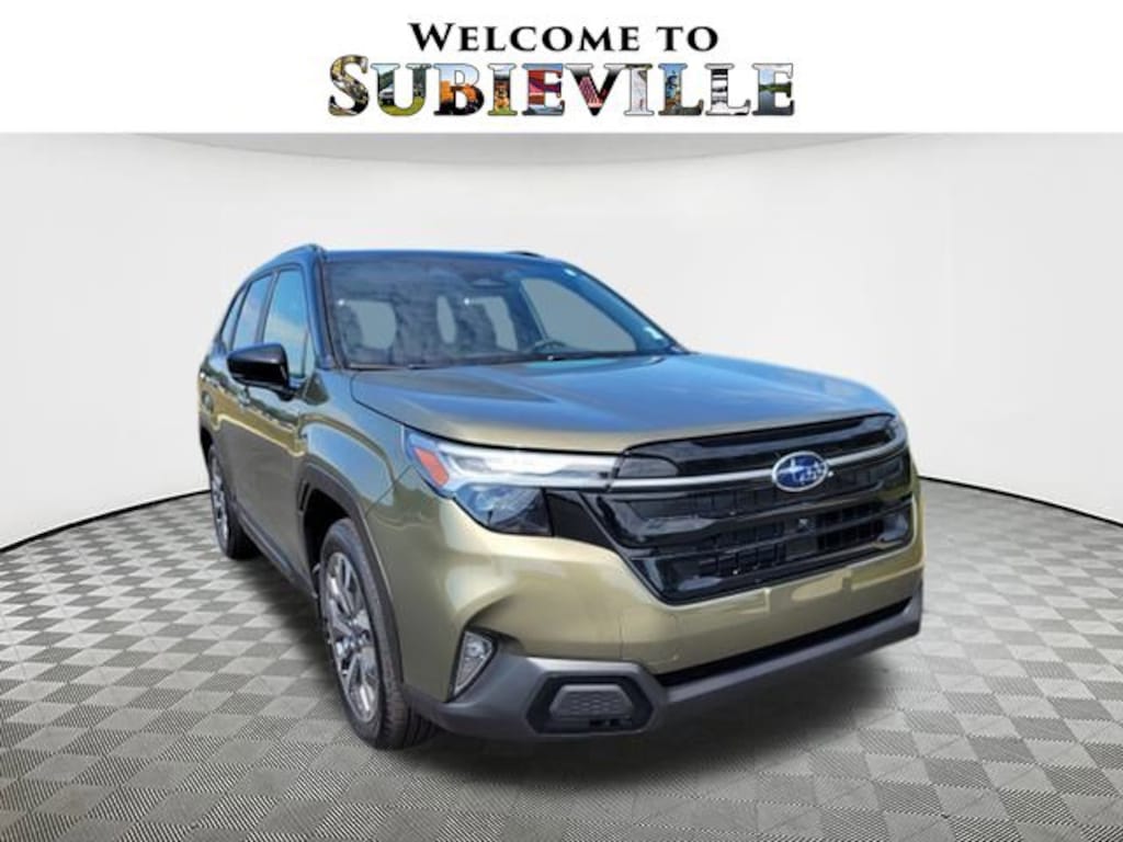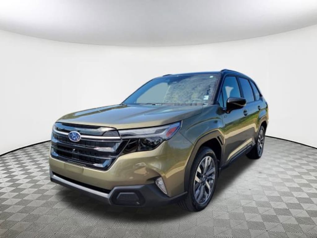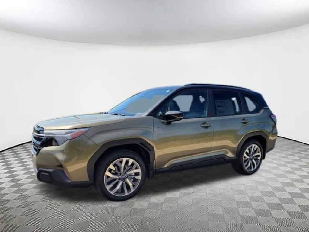 2025 Subaru Forester Hybrid Touring Autumn Green Metallic/Crystal Black Silica 2.5L 4-Cylinder DOHC 16V, 11 Speakers, 4-Wheel Disc Brakes, ABS brakes, Air Conditioning, Alloy wheels, AM/FM radio: SiriusXM with 360L, Anti-whiplash front head restraints, Auto High-beam Headlights, Automatic temperature control, Brake assist, Bumpers: body-color, Compass, Driver door bin, Driver vanity mirror, Dual front impact airbags, Dual front side impact airbags, Electronic Stability Control, Exterior Parking Camera Rear, Four wheel independent suspension, Front anti-roll bar, Front Bucket Seats, Front Center Armrest, Front dual zone A/C, Front fog lights, Front reading lights, Fully automatic headlights, harman/kardon® Speakers, Heated & Ventilated Front Bucket Seats, Heated door mirrors, Heated front seats, Heated rear seats, Heated steering wheel, HVAC memory, Illuminated entry, Knee airbag, Low tire pressure warning, Memory seat, Navigation system: TomTom Navigation w/what3words, Occupant sensing airbag, Outside temperature display, Overhead airbag, Overhead console, Panic alarm, Passenger door bin, Passenger vanity mirror, Perforated Leather-Trimmed Upholstery, Power door mirrors, Power driver seat, Power Liftgate, Power moonroof: Panoramic, Power passenger seat, Power steering, Power windows, Radio data system, Rear anti-roll bar, Rear seat center armrest, Rear window defroster, Rear window wiper, Remote keyless entry, Security system, Speed control, Speed-sensing steering, Split folding rear seat, Spoiler, Standard Model, Steering wheel mounted audio controls, Tachometer, Telescoping steering wheel, Tilt steering wheel, Traction control, Trip computer, Turn signal indicator mirrors, Variably intermittent wipers, Ventilated front seats, Wheels: 19" x 7.5 J Dark Gray Aluminum-Alloy, 2.5L 4-Cylinder DOHC 16V. AWD Lineartronic CVT 35/34 City/Highway MPG 2.5L 4-Cylinder DOHC 16V