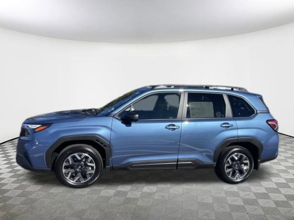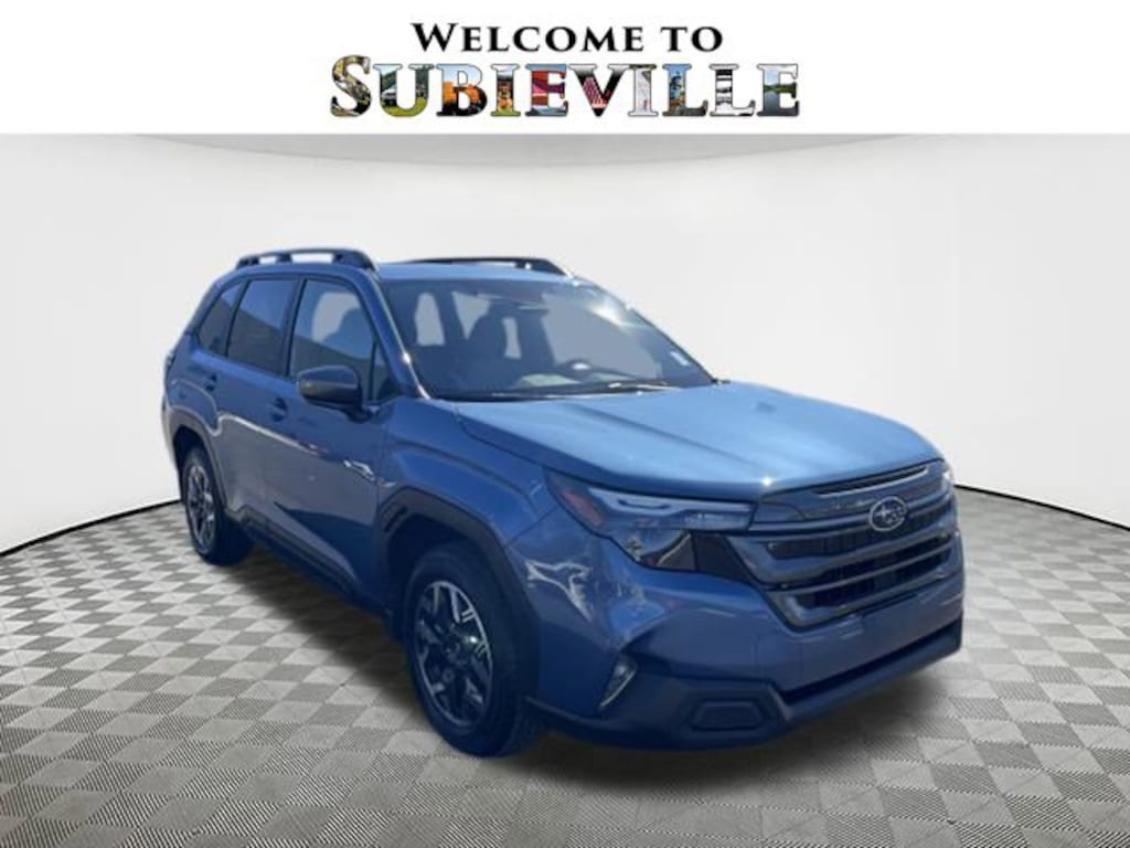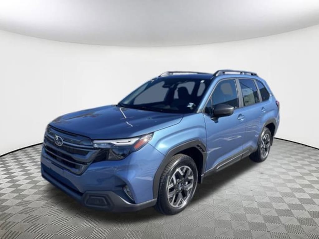 2025 Subaru Forester Premium Horizon Blue Pearl 4-Wheel Disc Brakes, 6 Speakers, ABS brakes, Air Conditioning, Alloy wheels, AM/FM radio: SiriusXM with 360L, Anti-whiplash front head restraints, Auto High-beam Headlights, Automatic temperature control, Brake assist, Bumpers: body-color, Driver door bin, Driver vanity mirror, Dual front impact airbags, Dual front side impact airbags, Electronic Stability Control, Emergency communication system: MySubaru Safety (3-year free trial), Exterior Parking Camera Rear, Four wheel independent suspension, Front anti-roll bar, Front Bucket Seats, Front Center Armrest, Front dual zone A/C, Front fog lights, Front reading lights, Fully automatic headlights, Heated door mirrors, Heated Front Bucket Seats, Heated front seats, Illuminated entry, Knee airbag, Leather steering wheel, Low tire pressure warning, Occupant sensing airbag, Outside temperature display, Overhead airbag, Overhead console, Panic alarm, Passenger door bin, Passenger vanity mirror, Power door mirrors, Power driver seat, Power moonroof: Panoramic, Power steering, Power windows, Premium Textured Cloth Upholstery, Radio data system, Radio: Subaru 11.6" Multimedia Plus System, Rear anti-roll bar, Rear seat center armrest, Rear window defroster, Rear window wiper, Remote keyless entry, Security system, Speed control, Speed-sensing steering, Split folding rear seat, Spoiler, Steering wheel mounted audio controls, Tachometer, Telescoping steering wheel, Tilt steering wheel, Traction control, Trip computer, Variably intermittent wipers, Wheels: 17" x 7.0 J Dark Metallic Aluminum-Alloy. AWD Lineartronic CVT 26/33 City/Highway MPG 2.5L 4-Cylinder DOHC 16V