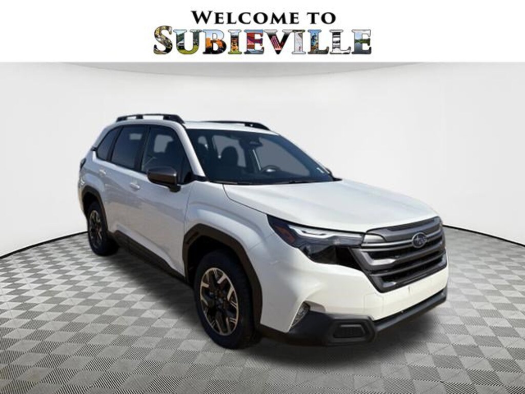 2026 Subaru Forester Premium Crystal White Pearl 4-Wheel Disc Brakes, 6 Speakers, ABS brakes, Air Conditioning, Alloy wheels, AM/FM radio: SiriusXM with 360L, Anti-whiplash front head restraints, Auto High-beam Headlights, Automatic temperature control, Brake assist, Bumpers: body-color, Driver door bin, Driver vanity mirror, Dual front impact airbags, Dual front side impact airbags, Electronic Stability Control, Emergency communication system: MySubaru Companion (5-years free), Exterior Parking Camera Rear, Four wheel independent suspension, Front anti-roll bar, Front Bucket Seats, Front Center Armrest, Front dual zone A/C, Front fog lights, Front reading lights, Fully automatic headlights, Heated door mirrors, Heated Front Bucket Seats, Heated front seats, Illuminated entry, Knee airbag, Leather steering wheel, Low tire pressure warning, Occupant sensing airbag, Outside temperature display, Overhead airbag, Overhead console, Panic alarm, Passenger door bin, Passenger vanity mirror, Power door mirrors, Power driver seat, Power moonroof: Panoramic, Power steering, Power windows, Premium Textured Cloth Upholstery, Radio data system, Radio: Subaru 11.6" Multimedia Plus System, Rear anti-roll bar, Rear seat center armrest, Rear window defroster, Rear window wiper, Remote keyless entry, Security system, Speed control, Speed-sensing steering, Split folding rear seat, Spoiler, Steering wheel mounted audio controls, Tachometer, Telescoping steering wheel, Tilt steering wheel, Traction control, Trip computer, Variably intermittent wipers, Wheels: 17" x 7.0 J Dark Metallic Aluminum-Alloy. AWD Lineartronic CVT 26/33 City/Highway MPG 2.5L 4-Cylinder DOHC 16V