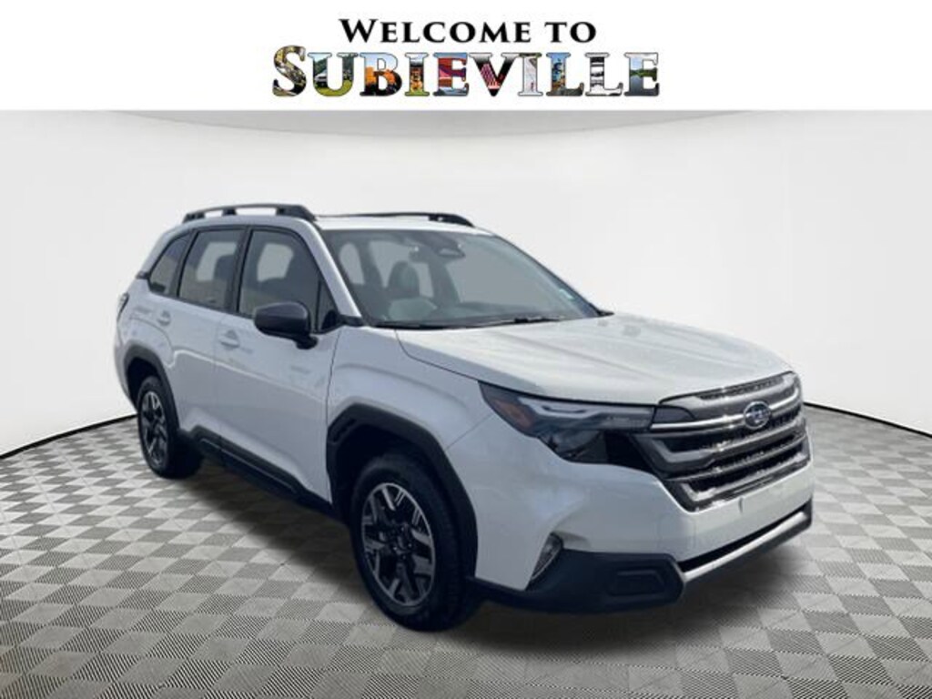 2026 Subaru Forester Premium Crystal White Pearl 4-Wheel Disc Brakes, 6 Speakers, ABS brakes, Air Conditioning, Alloy wheels, AM/FM radio: SiriusXM with 360L, Anti-whiplash front head restraints, Auto High-beam Headlights, Automatic temperature control, Brake assist, Bumpers: body-color, Driver door bin, Driver vanity mirror, Dual front impact airbags, Dual front side impact airbags, Electronic Stability Control, Emergency communication system: MySubaru Companion (5-years free), Exterior Parking Camera Rear, Four wheel independent suspension, Front anti-roll bar, Front Bucket Seats, Front Center Armrest, Front dual zone A/C, Front fog lights, Front reading lights, Fully automatic headlights, Heated door mirrors, Heated Front Bucket Seats, Heated front seats, Illuminated entry, Knee airbag, Leather steering wheel, Low tire pressure warning, Occupant sensing airbag, Outside temperature display, Overhead airbag, Overhead console, Panic alarm, Passenger door bin, Passenger vanity mirror, Power door mirrors, Power driver seat, Power moonroof: Panoramic, Power steering, Power windows, Premium Textured Cloth Upholstery, Radio data system, Radio: Subaru 11.6" Multimedia Plus System, Rear anti-roll bar, Rear seat center armrest, Rear window defroster, Rear window wiper, Remote keyless entry, Security system, Speed control, Speed-sensing steering, Split folding rear seat, Spoiler, Steering wheel mounted audio controls, Tachometer, Telescoping steering wheel, Tilt steering wheel, Traction control, Trip computer, Variably intermittent wipers, Wheels: 17" x 7.0 J Dark Metallic Aluminum-Alloy. AWD Lineartronic CVT 26/33 City/Highway MPG 2.5L 4-Cylinder DOHC 16V