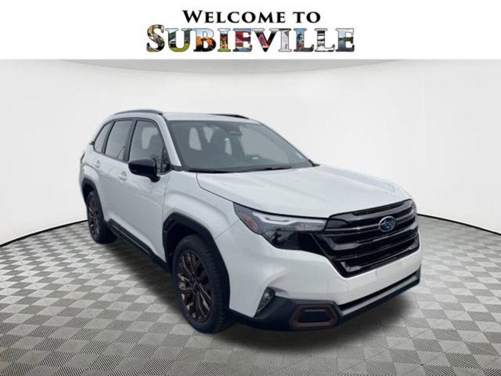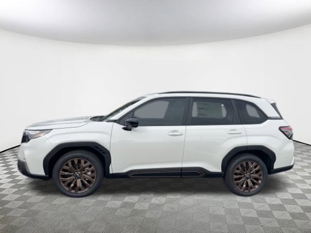 2026 Subaru Forester Sport Crystal White Pearl 4-Wheel Disc Brakes, 6 Speakers, ABS brakes, Air Conditioning, Alloy wheels, AM/FM radio: SiriusXM with 360L, Anti-whiplash front head restraints, Auto High-beam Headlights, Automatic temperature control, Brake assist, Bumpers: body-color, Driver door bin, Driver vanity mirror, Dual front impact airbags, Dual front side impact airbags, Electronic Stability Control, Emergency communication system: MySubaru Companion (5-years free), Exterior Parking Camera Rear, Four wheel independent suspension, Front anti-roll bar, Front Bucket Seats, Front Center Armrest, Front dual zone A/C, Front fog lights, Front reading lights, Fully automatic headlights, Heated door mirrors, Heated Front Bucket Seats, Heated front seats, Illuminated entry, Knee airbag, Leather steering wheel, Low tire pressure warning, Occupant sensing airbag, Outside temperature display, Overhead airbag, Overhead console, Panic alarm, Passenger door bin, Passenger vanity mirror, Power door mirrors, Power driver seat, Power moonroof: Panoramic, Power steering, Power windows, Radio data system, Radio: Subaru 11.6" Multimedia Plus System, Rear anti-roll bar, Rear seat center armrest, Rear window defroster, Rear window wiper, Remote keyless entry, Security system, Speed control, Speed-sensing steering, Split folding rear seat, Spoiler, Sport StarTex Upholstery, Steering wheel mounted audio controls, Tachometer, Telescoping steering wheel, Tilt steering wheel, Traction control, Trip computer, Turn signal indicator mirrors, Variably intermittent wipers, Wheels: 19" x 7.5 J Bronze Finish Aluminum-Alloy. AWD Lineartronic CVT 25/32 City/Highway MPG 2.5L 4-Cylinder DOHC 16V